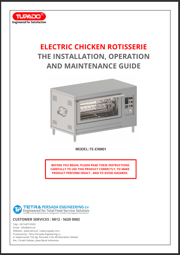 Tetra Persada Engineering cv gives a 12-month warranty with certain conditions. Tetra Persada Engineering cv will decline any claims of accidents cause by improper use, disobey rules, and/or disobey warmings. Below are cases which invalidate the guarantee: 1. Improper use by an untrained person (s) 2. Disobey local regulation (s) related to installation and safety standards 3. Not doing routine maintenance 4. Replace certain parts with non-genuine spare parts 5. Not following the instructions in the manual properly