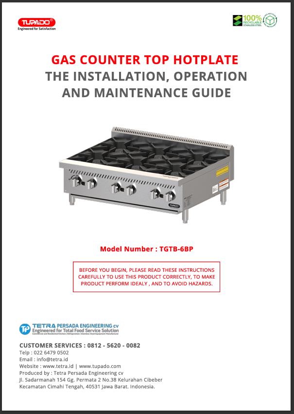Tetra Persada Engineering cv gives a 12-month warranty with certain conditions. Tetra Persada Engineering cv will decline any claims of accidents cause by improper use, disobey rules, and/or disobey warmings. Below are cases which invalidate the guarantee: 1. Improper use by an untrained person (s) 2. Disobey local regulation (s) related to installation and safety standards 3. Not doing routine maintenance 4. Replace certain parts with non-genuine spare parts 5. Not following the instructions in the manual properly